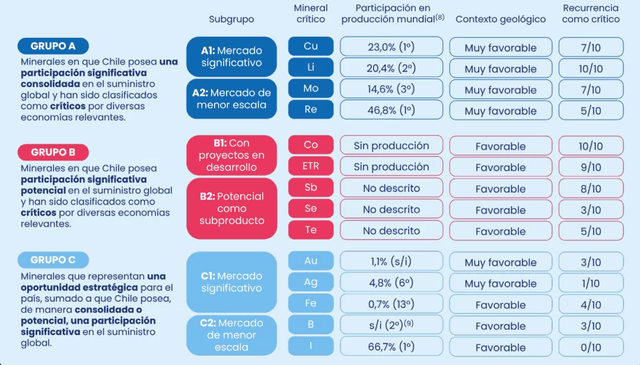 La estrategia identifica como minerales críticos para Chile al cobre, litio, molibdeno, renio, cobalto, elementos de tierras raras, antimonio, selenio, telurio, oro, plata, hierro, boro y yodo. Estos se agrupan en tres categorías. El Grupo A incluye aquellos en los que el país ya posee una posición consolidada a nivel mundial, como el cobre (23% de participación global), litio (20,4%), molibdeno (14,6%) y renio (46,8%). El Grupo B considera minerales con potencial de desarrollo productivo, como cobalto, tierras raras, antimonio, selenio y telurio. En tanto, el Grupo C incorpora recursos donde Chile ya produce, pero que representan una oportunidad estratégica para fortalecer su presencia internacional, como oro, plata, hierro, boro y yodo.